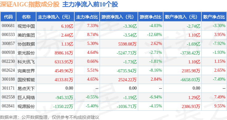 资金流向方面,深证AIGC(970075)指数成份股当日主力资金净流出合计69.39亿元,游资资金净流入合计11.09亿元,散户资金净流入合计58.3亿元。成份股资金流向详情见下表: