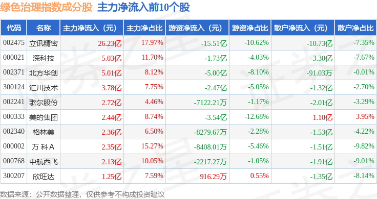 资金流向方面,绿色治理(980058)指数成份股当日主力资金净流出合计11.12亿元,游资资金净流出合计17.32亿元,散户资金净流入合计28.44亿元。成份股资金流向详情见下表: