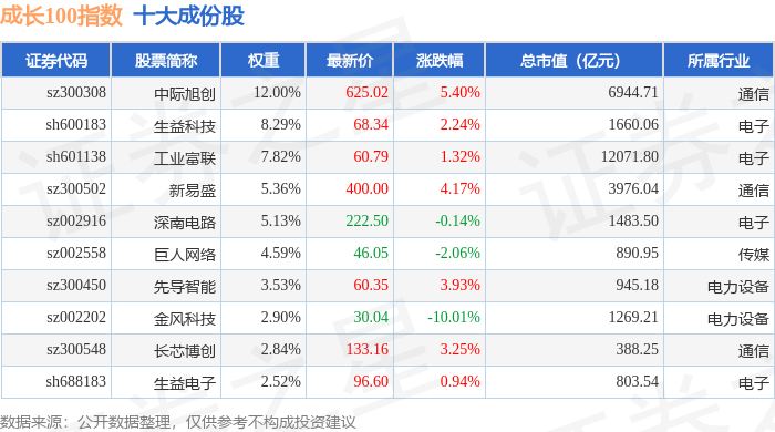 成长100(980080)指数十大成份股详情如下: