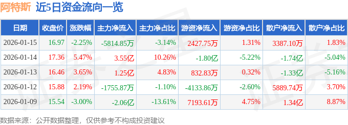 证券之星消息,截至2026年1月15日收盘,阿特斯(688472)报收于16.97元,下跌2.25%,换手率7.95%,成交量107.18万手,成交额18.52亿元。