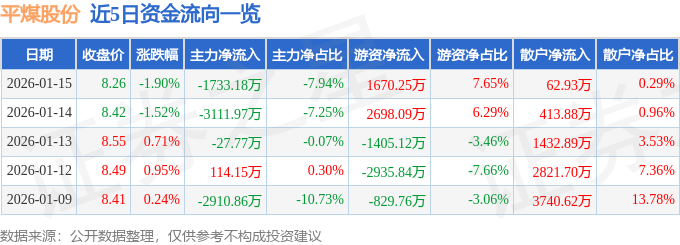 证券之星消息,截至2026年1月15日收盘,平煤股份(601666)报收于8.26元,下跌1.9%,换手率1.07%,成交量26.34万手,成交额2.18亿元。