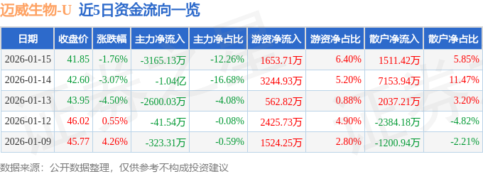 证券之星消息,截至2026年1月15日收盘,迈威生物(688062)报收于41.85元,下跌1.76%,换手率3.02%,成交量6.16万手,成交额2.58亿元。