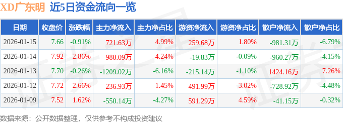 证券之星消息,截至2026年1月15日收盘,XD广东明(600382)报收于7.66元,下跌0.91%,换手率2.74%,成交量19.0万手,成交额1.44亿元。