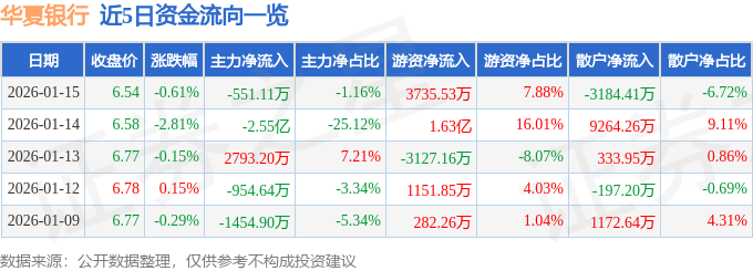 证券之星消息,截至2026年1月15日收盘,华夏银行(600015)报收于6.54元,下跌0.61%,换手率0.47%,成交量72.15万手,成交额4.74亿元。