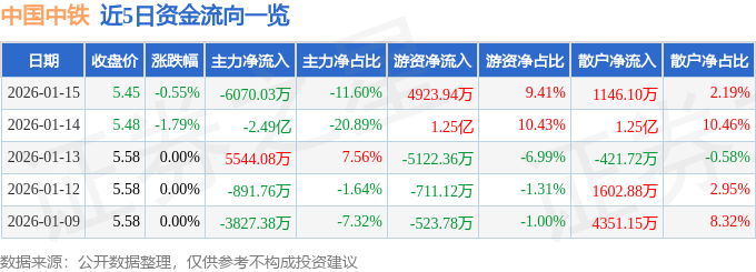 证券之星消息,截至2026年1月15日收盘,中国中铁(601390)报收于5.45元,下跌0.55%,换手率0.47%,成交量95.66万手,成交额5.23亿元。