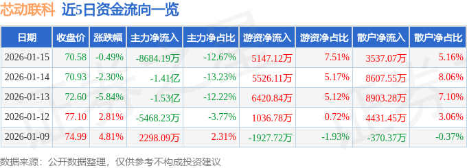 证券之星消息,截至2026年1月15日收盘,芯动联科(688582)报收于70.58元,下跌0.49%,换手率3.94%,成交量9.87万手,成交额6.85亿元。