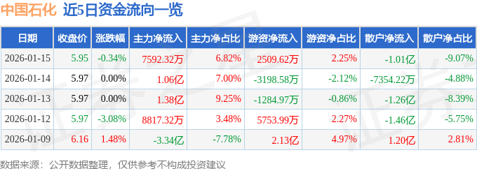 证券之星消息,截至2026年1月15日收盘,中国石化(600028)报收于5.95元,下跌0.34%,换手率0.2%,成交量186.82万手,成交额11.14亿元。