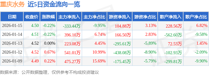 证券之星消息,截至2026年1月15日收盘,重庆水务(601158)报收于4.5元,下跌0.22%,换手率0.16%,成交量7.44万手,成交额3350.92万元。