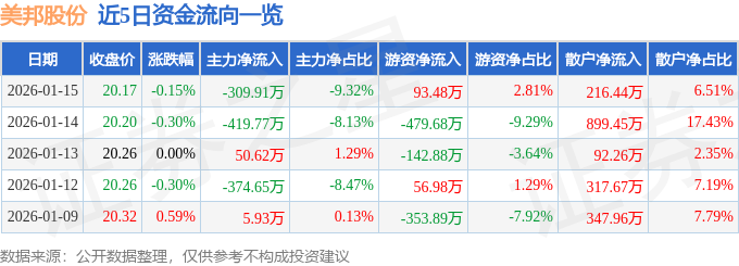 证券之星消息,截至2026年1月15日收盘,美邦股份(605033)报收于20.17元,下跌0.15%,换手率1.22%,成交量1.65万手,成交额3326.24万元。