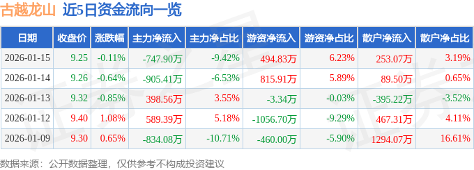 1月15日的资金流向数据方面,主力资金净流出747.9万元,占总成交额9.42%,游资资金净流入494.83万元,占总成交额6.23%,散户资金净流入253.07万元,占总成交额3.19%。