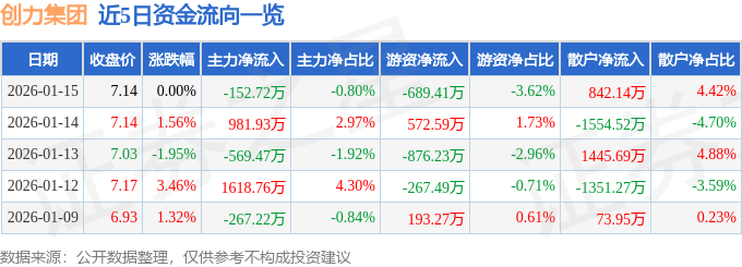 证券之星消息,截至2026年1月15日收盘,创力集团(603012)报收于7.14元,上涨0.0%,换手率4.13%,成交量26.69万手,成交额1.9亿元。