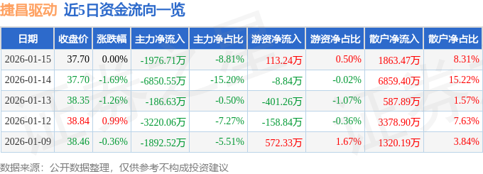 证券之星消息,截至2026年1月15日收盘,捷昌驱动(603583)报收于37.7元,上涨0.0%,换手率1.56%,成交量5.94万手,成交额2.24亿元。