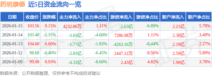 1月15日的资金流向数据方面,主力资金净流入4232.86万元,占总成交额1.11%,游资资金净流出2.63亿元,占总成交额6.89%,散户资金净流入2.21亿元,占总成交额5.78%。