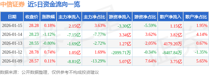 证券之星消息,截至2026年1月15日收盘,中信证券(600030)报收于28.28元,上涨0.18%,换手率1.71%,成交量207.81万手,成交额59.05亿元。