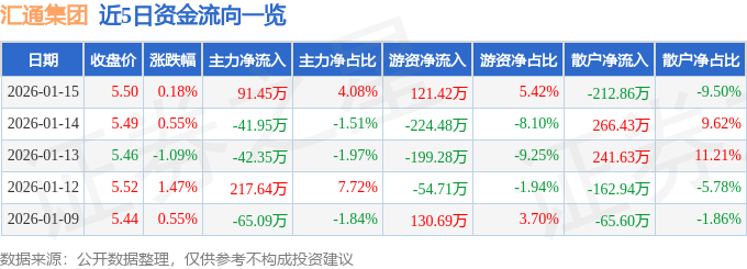 证券之星消息,截至2026年1月15日收盘,汇通集团(603176)报收于5.5元,上涨0.18%,换手率0.88%,成交量4.08万手,成交额2239.86万元。
