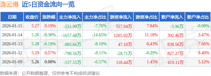 证券之星消息,截至2026年1月15日收盘,连云港(601008)报收于5.27元,上涨0.19%,换手率1.09%,成交量13.51万手,成交额7116.46万元。