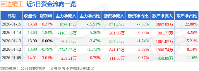 证券之星消息,截至2026年1月15日收盘,百达精工(603331)报收于13.68元,上涨0.37%,换手率4.5%,成交量9.1万手,成交额1.25亿元。
