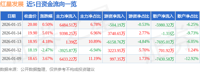 证券之星消息,截至2026年1月15日收盘,红星发展(600367)报收于20.0元,上涨0.5%,换手率14.79%,成交量47.63万手,成交额9.57亿元。