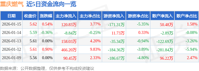 证券之星消息,截至2026年1月15日收盘,重庆燃气(600917)报收于5.62元,上涨0.54%,换手率0.37%,成交量5.71万手,成交额3200.8万元。