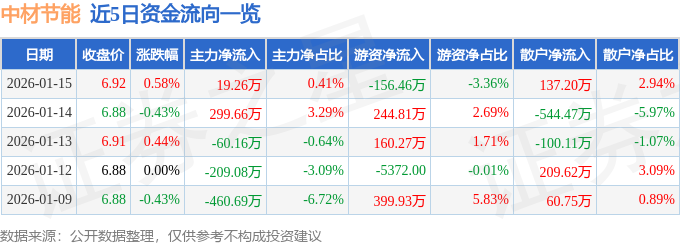 证券之星消息,截至2026年1月15日收盘,中材节能(603126)报收于6.92元,上涨0.58%,换手率1.11%,成交量6.77万手,成交额4663.26万元。