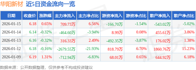 证券之星消息,截至2026年1月15日收盘,华阳新材(600281)报收于6.18元,上涨0.65%,换手率3.39%,成交量17.46万手,成交额1.08亿元。