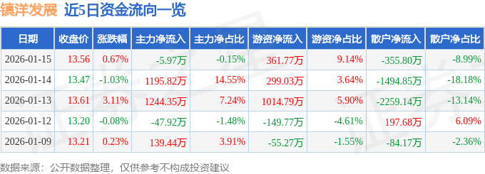 证券之星消息,截至2026年1月15日收盘,镇洋发展(603213)报收于13.56元,上涨0.67%,换手率0.66%,成交量2.91万手,成交额3956.62万元。