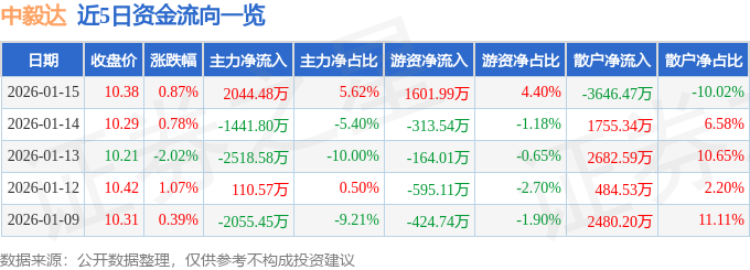 证券之星消息,截至2026年1月15日收盘,中毅达(600610)报收于10.38元,上涨0.87%,换手率4.91%,成交量34.82万手,成交额3.64亿元。