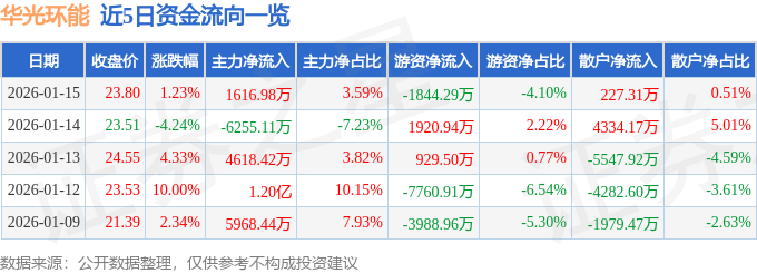 证券之星消息,截至2026年1月15日收盘,华光环能(600475)报收于23.8元,上涨1.23%,换手率2.02%,成交量19.02万手,成交额4.5亿元。
