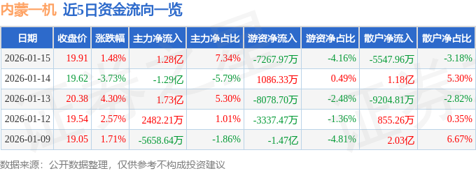 证券之星消息,截至2026年1月15日收盘,内蒙一机(600967)报收于19.91元,上涨1.48%,换手率5.11%,成交量86.98万手,成交额17.46亿元。