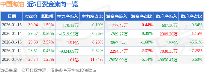 证券之星消息,截至2026年1月15日收盘,中国海油(600938)报收于30.04元,上涨1.59%,换手率1.98%,成交量59.15万手,成交额17.8亿元。