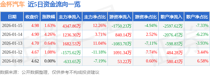 证券之星消息,截至2026年1月15日收盘,金杯汽车(600609)报收于4.98元,上涨1.63%,换手率5.44%,成交量70.91万手,成交额3.55亿元。
