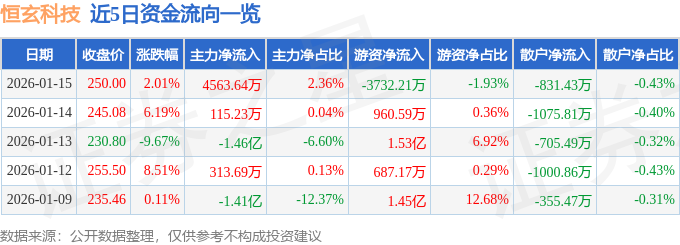 证券之星消息,截至2026年1月15日收盘,恒玄科技(688608)报收于250.0元,上涨2.01%,换手率4.63%,成交量7.81万手,成交额19.37亿元。