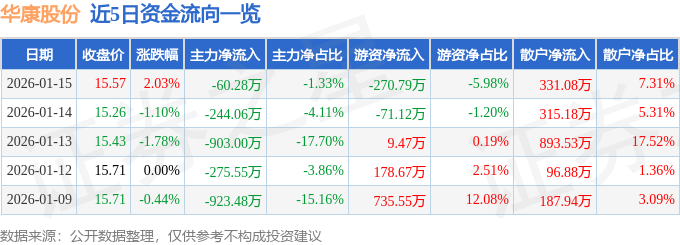 证券之星消息,截至2026年1月15日收盘,华康股份(605077)报收于15.57元,上涨2.03%,换手率0.97%,成交量2.92万手,成交额4529.65万元。