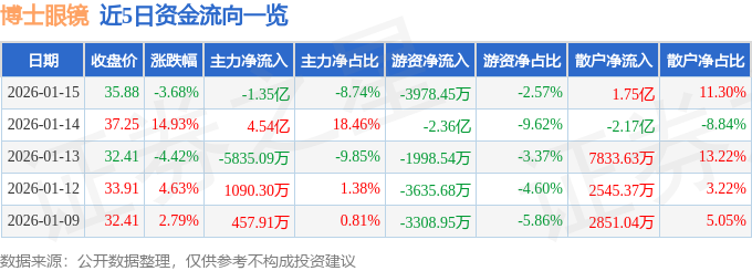 证券之星消息,截至2026年1月15日收盘,博士眼镜(300622)报收于35.88元,下跌3.68%,换手率27.18%,成交量42.34万手,成交额15.51亿元。