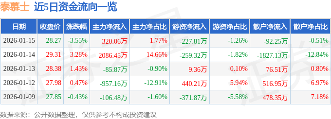 证券之星消息,截至2026年1月15日收盘,泰慕士(001234)报收于28.27元,下跌3.55%,换手率6.84%,成交量6.26万手,成交额1.81亿元。