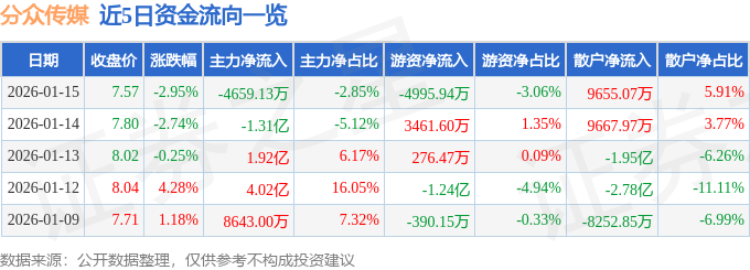 证券之星消息,截至2026年1月15日收盘,分众传媒(002027)报收于7.57元,下跌2.95%,换手率1.48%,成交量213.67万手,成交额16.33亿元。