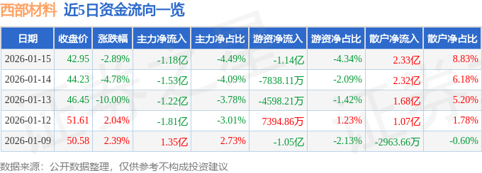 证券之星消息,截至2026年1月15日收盘,西部材料(002149)报收于42.95元,下跌2.89%,换手率12.73%,成交量62.13万手,成交额26.36亿元。