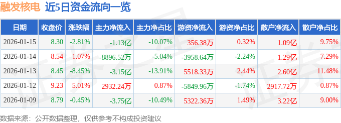 证券之星消息,截至2026年1月15日收盘,融发核电(002366)报收于8.3元,下跌2.81%,换手率7.31%,成交量135.19万手,成交额11.18亿元。