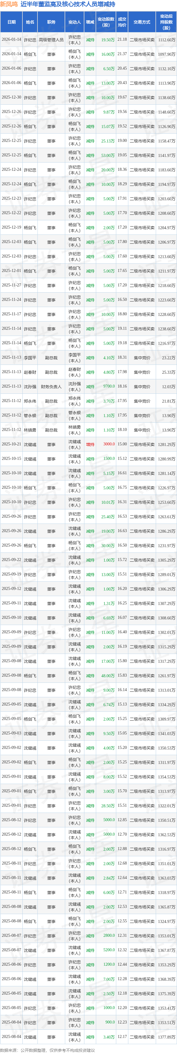 新凤鸣近半年内的董监高及核心技术人员增减持详情如下: