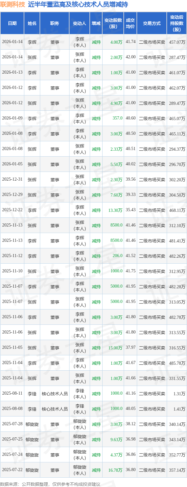 联测科技近半年内的董监高及核心技术人员增减持详情如下: