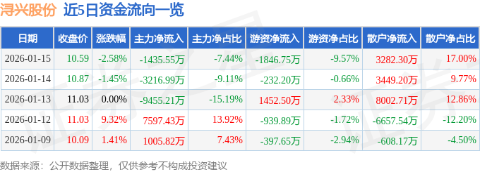 证券之星消息,截至2026年1月15日收盘,浔兴股份(002098)报收于10.59元,下跌2.58%,换手率5.07%,成交量18.16万手,成交额1.93亿元。