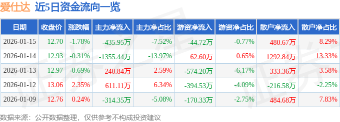 证券之星消息,截至2026年1月15日收盘,爱仕达(002403)报收于12.7元,下跌1.78%,换手率1.53%,成交量4.54万手,成交额5798.74万元。