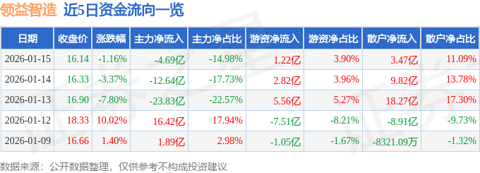 1月15日的资金流向数据方面,主力资金净流出4.69亿元,占总成交额14.98%,游资资金净流入1.22亿元,占总成交额3.9%,散户资金净流入3.47亿元,占总成交额11.09%。