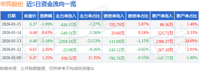 证券之星消息,截至2026年1月15日收盘,华民股份(300345)报收于6.37元,下跌1.09%,换手率1.87%,成交量8.97万手,成交额5721.69万元。