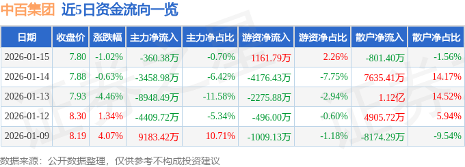 证券之星消息,截至2026年1月15日收盘,中百集团(000759)报收于7.8元,下跌1.02%,换手率9.86%,成交量64.63万手,成交额5.14亿元。