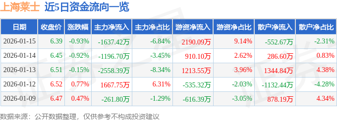 证券之星消息,截至2026年1月15日收盘,上海莱士(002252)报收于6.39元,下跌0.93%,换手率0.56%,成交量37.35万手,成交额2.4亿元。