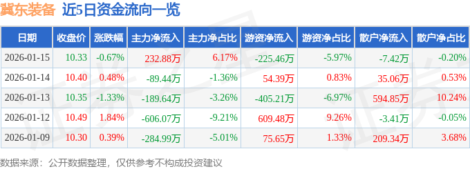 证券之星消息,截至2026年1月15日收盘,冀东装备(000856)报收于10.33元,下跌0.67%,换手率1.61%,成交量3.66万手,成交额3776.99万元。