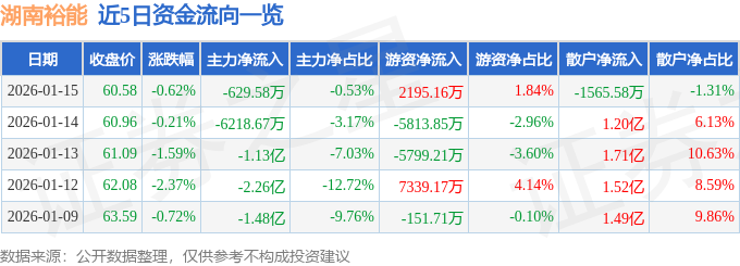 证券之星消息,截至2026年1月15日收盘,湖南裕能(301358)报收于60.58元,下跌0.62%,换手率5.06%,成交量19.53万手,成交额11.96亿元。