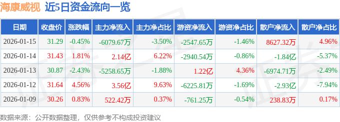 证券之星消息,截至2026年1月15日收盘,海康威视(002415)报收于31.29元,下跌0.45%,换手率0.61%,成交量55.62万手,成交额17.4亿元。