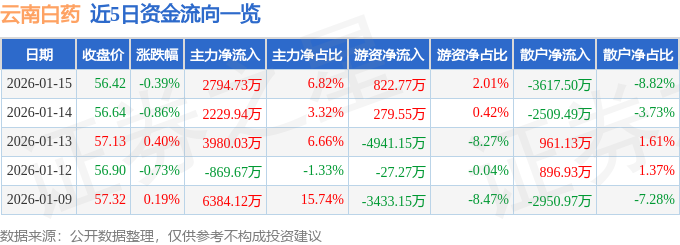 证券之星消息,截至2026年1月15日收盘,云南白药(000538)报收于56.42元,下跌0.39%,换手率0.41%,成交量7.25万手,成交额4.1亿元。